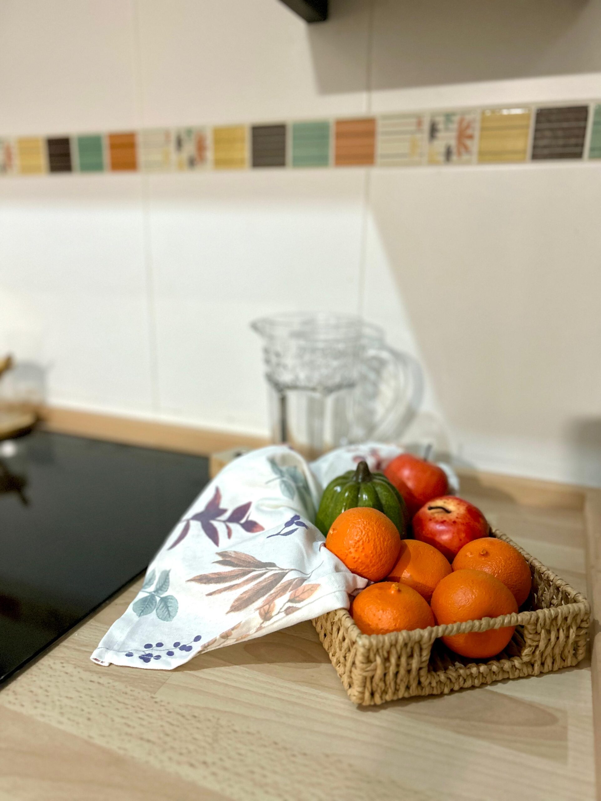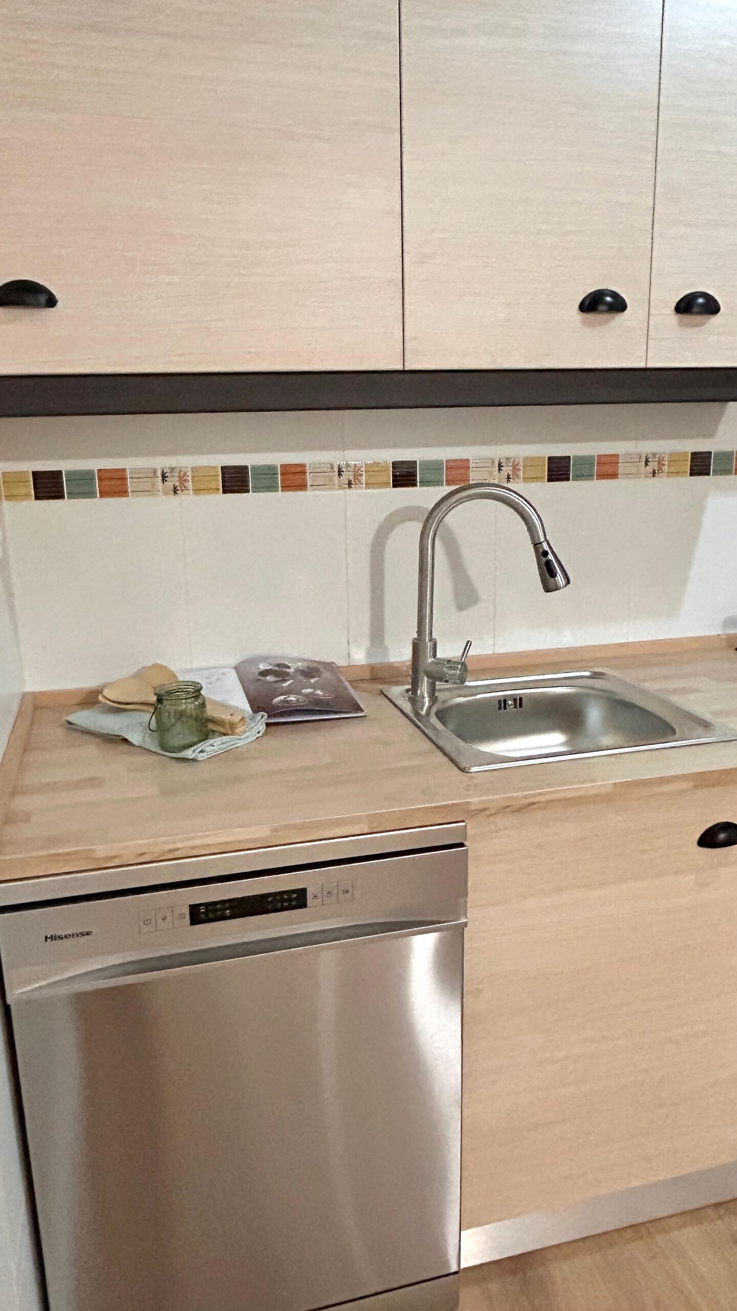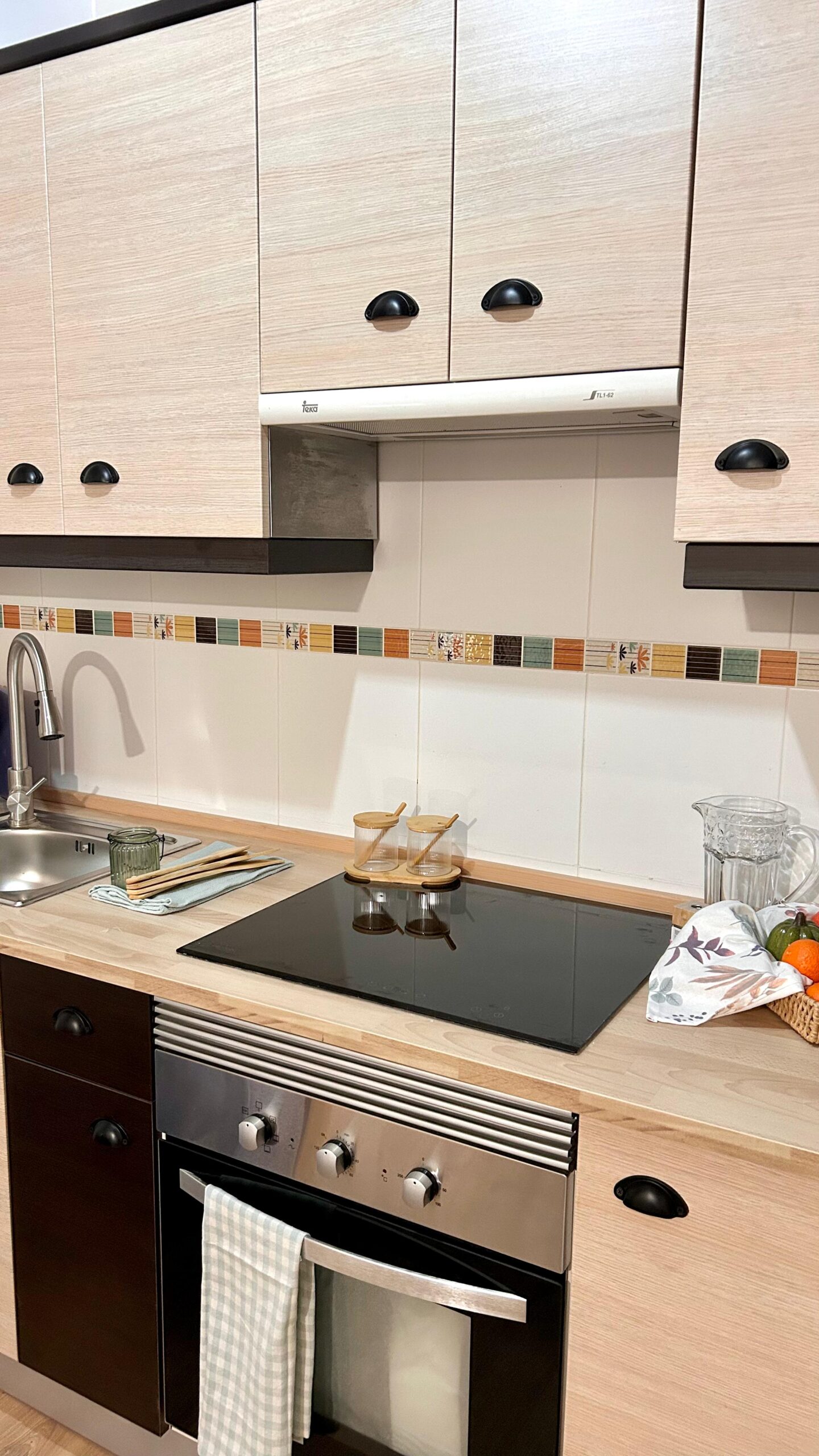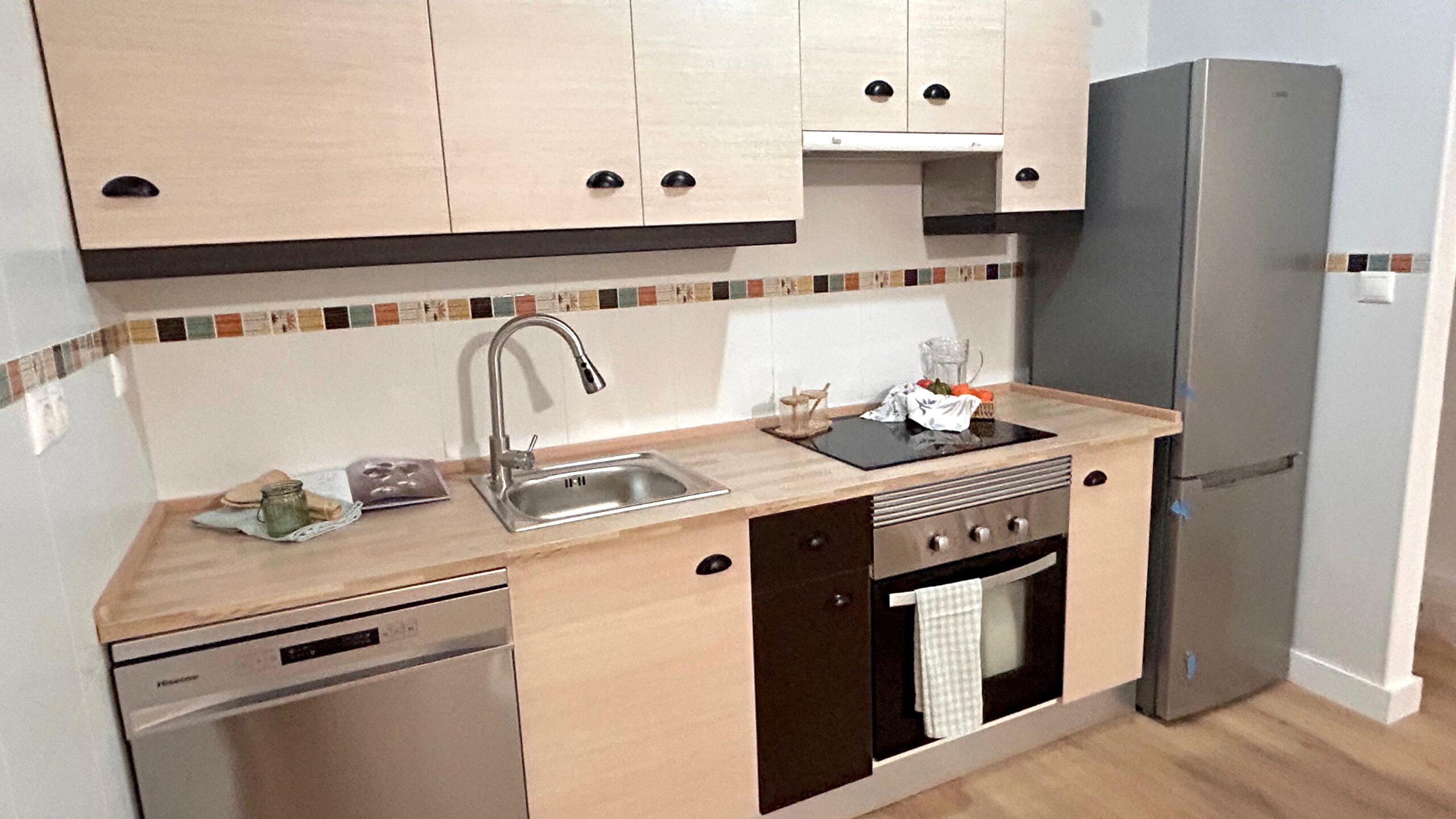 Cocina con electrodomésticos a estrenar: frigorífico, lavaplatos, vitrocerámica, horno, lavadora, calentador, extractor.
