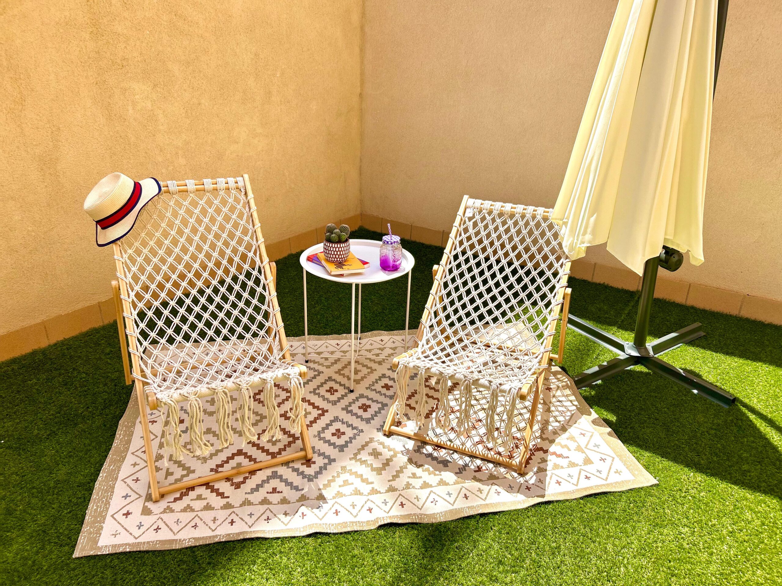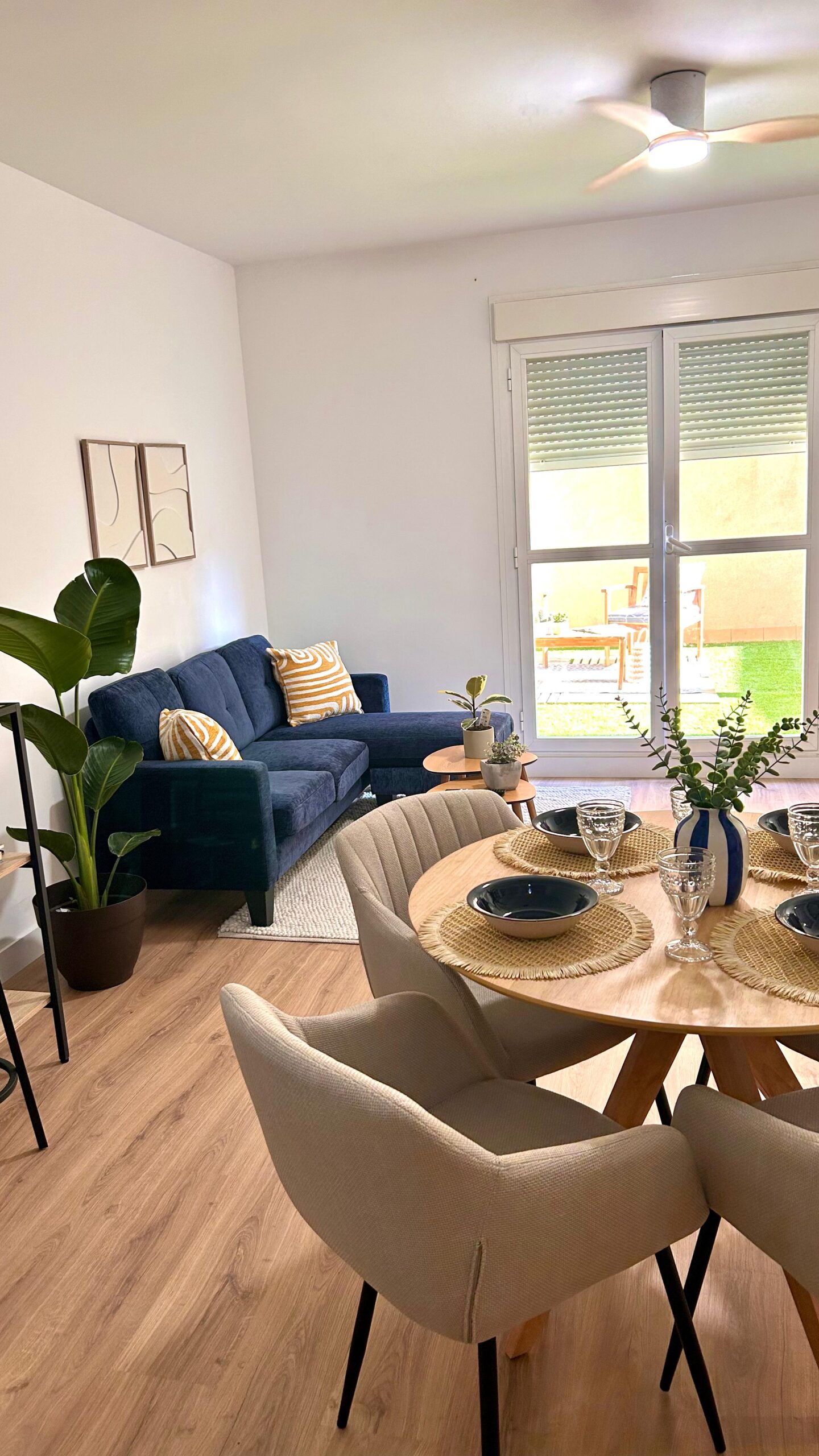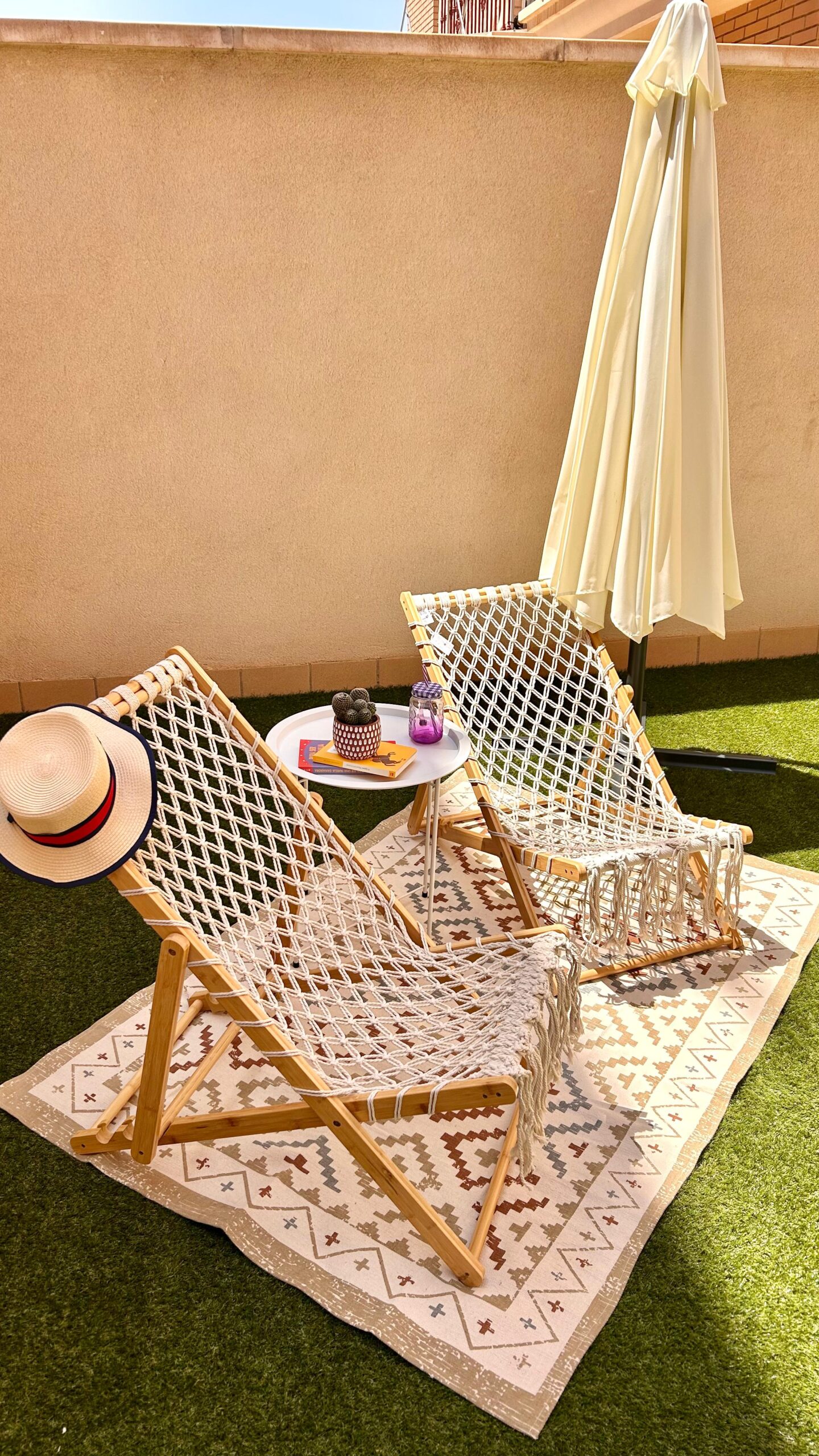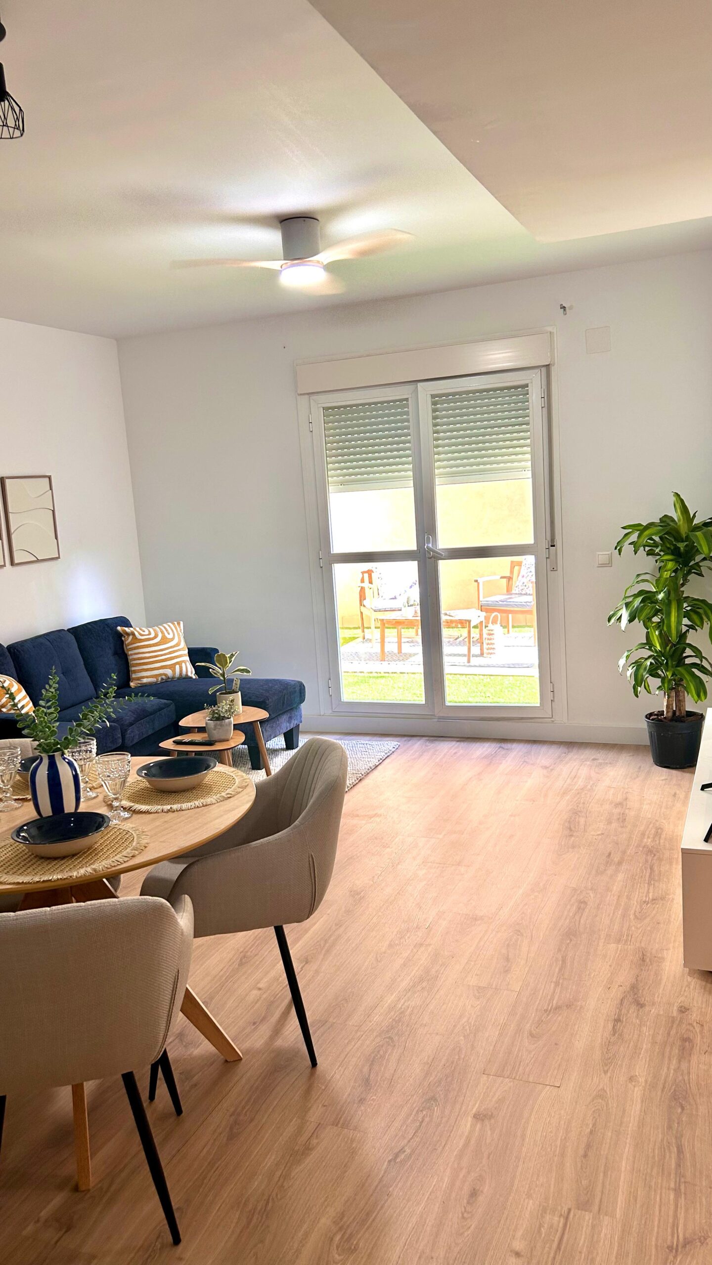 Juego de mesa y sillas, TV 50″, sofá, camas, colchones, armarios, decoración, menaje, ropa de cama, cortinas, desayunador, lámparas, tumbonas, sombrilla de 3 mt de sombra y muebles de jardín.
