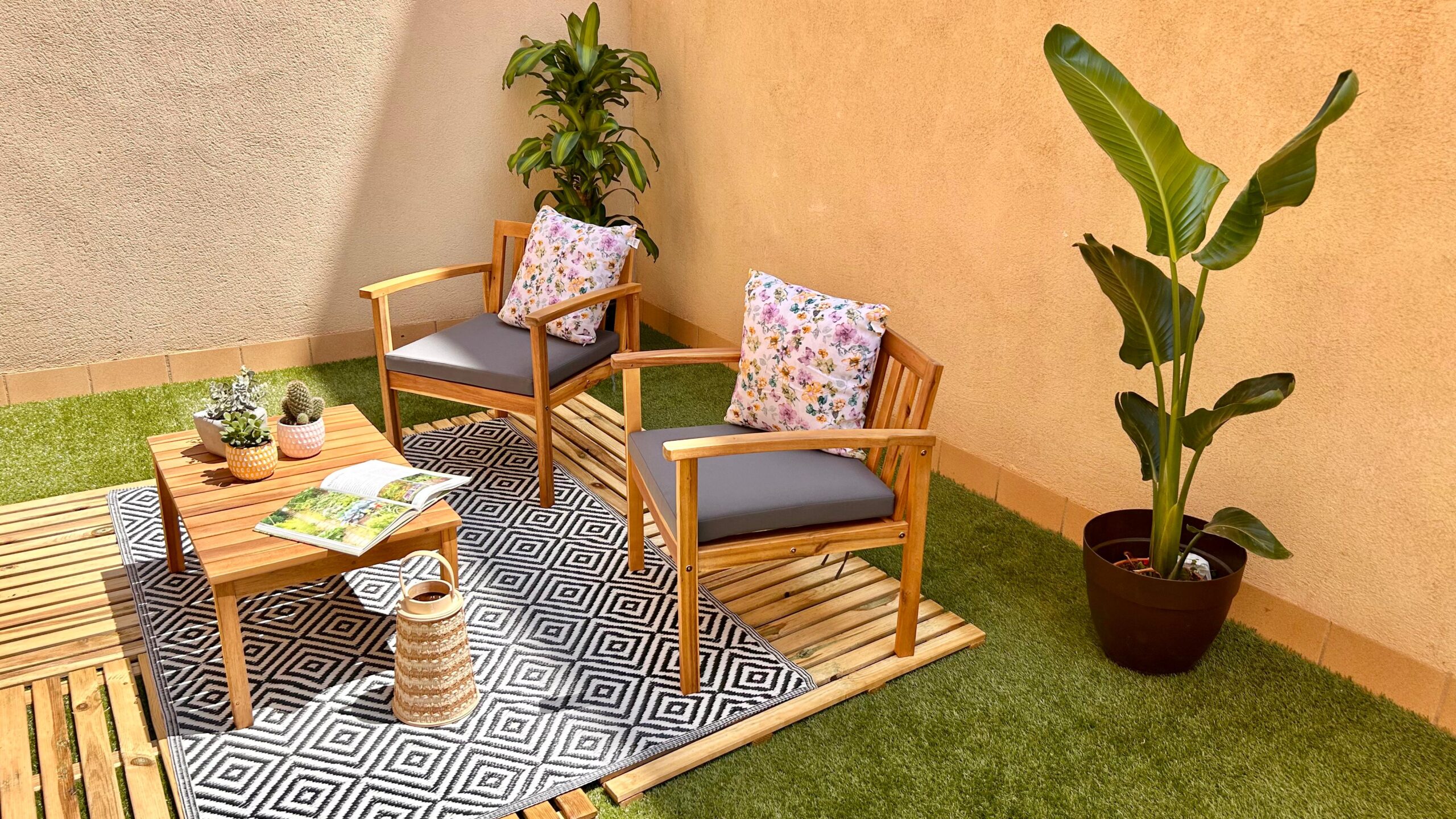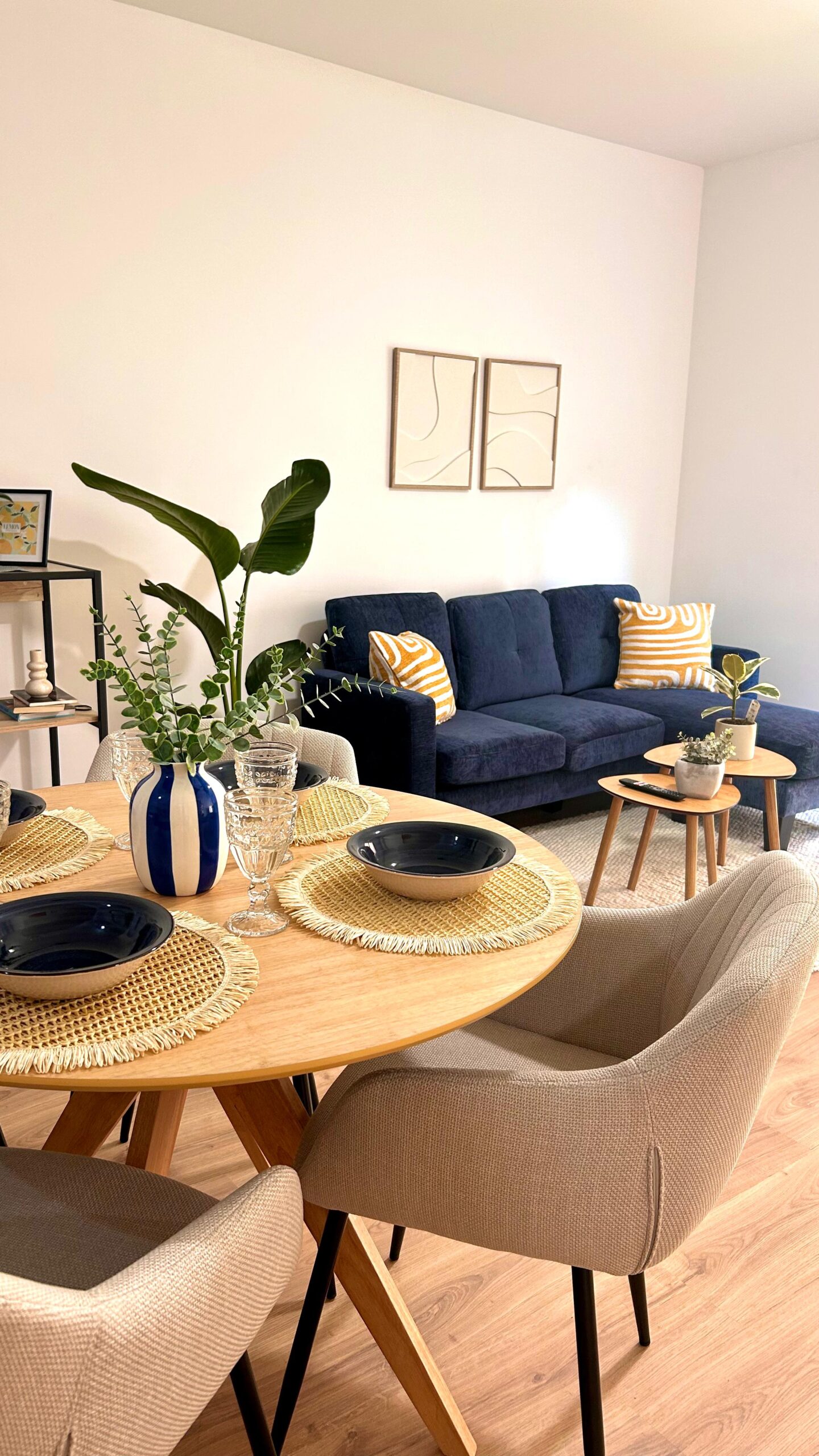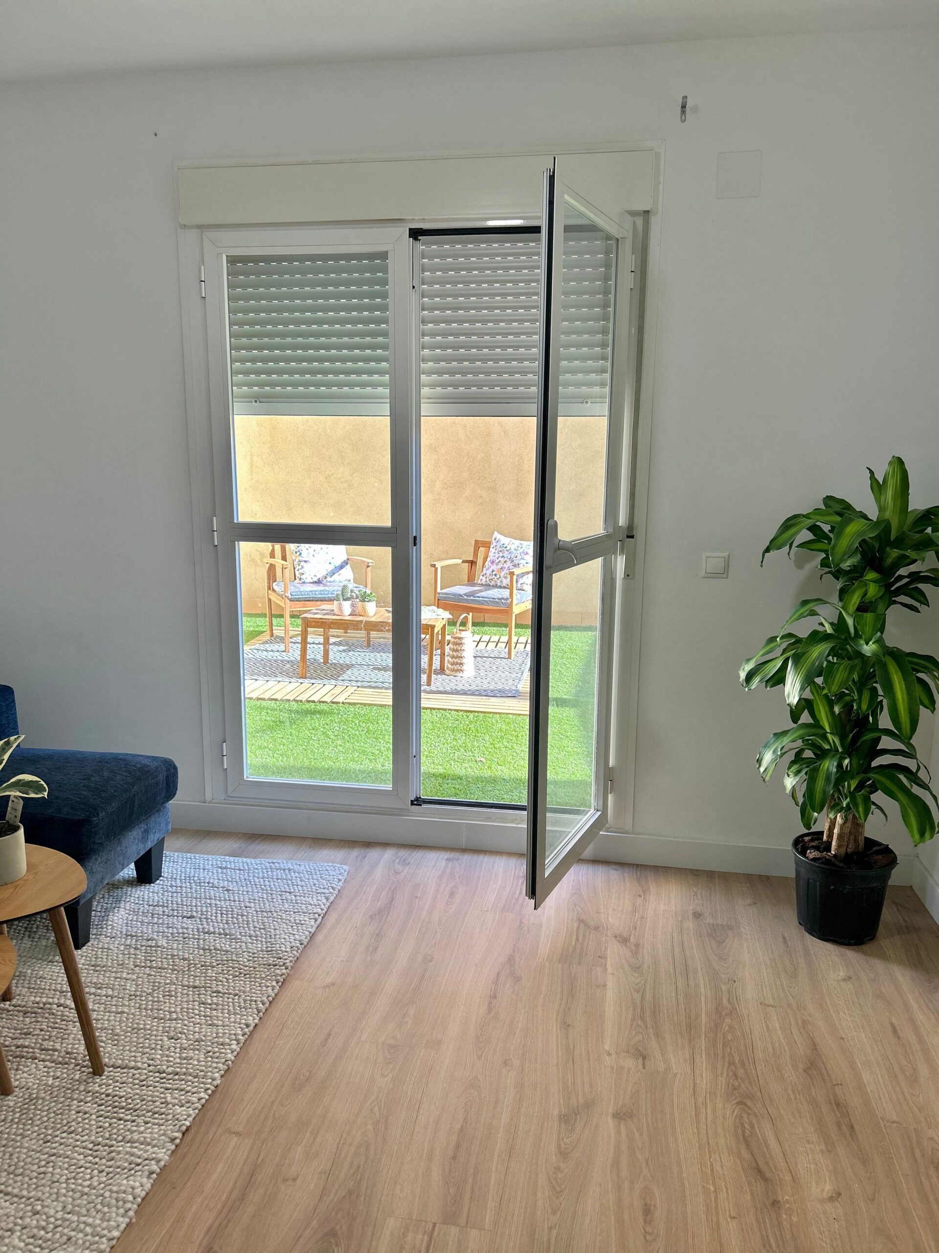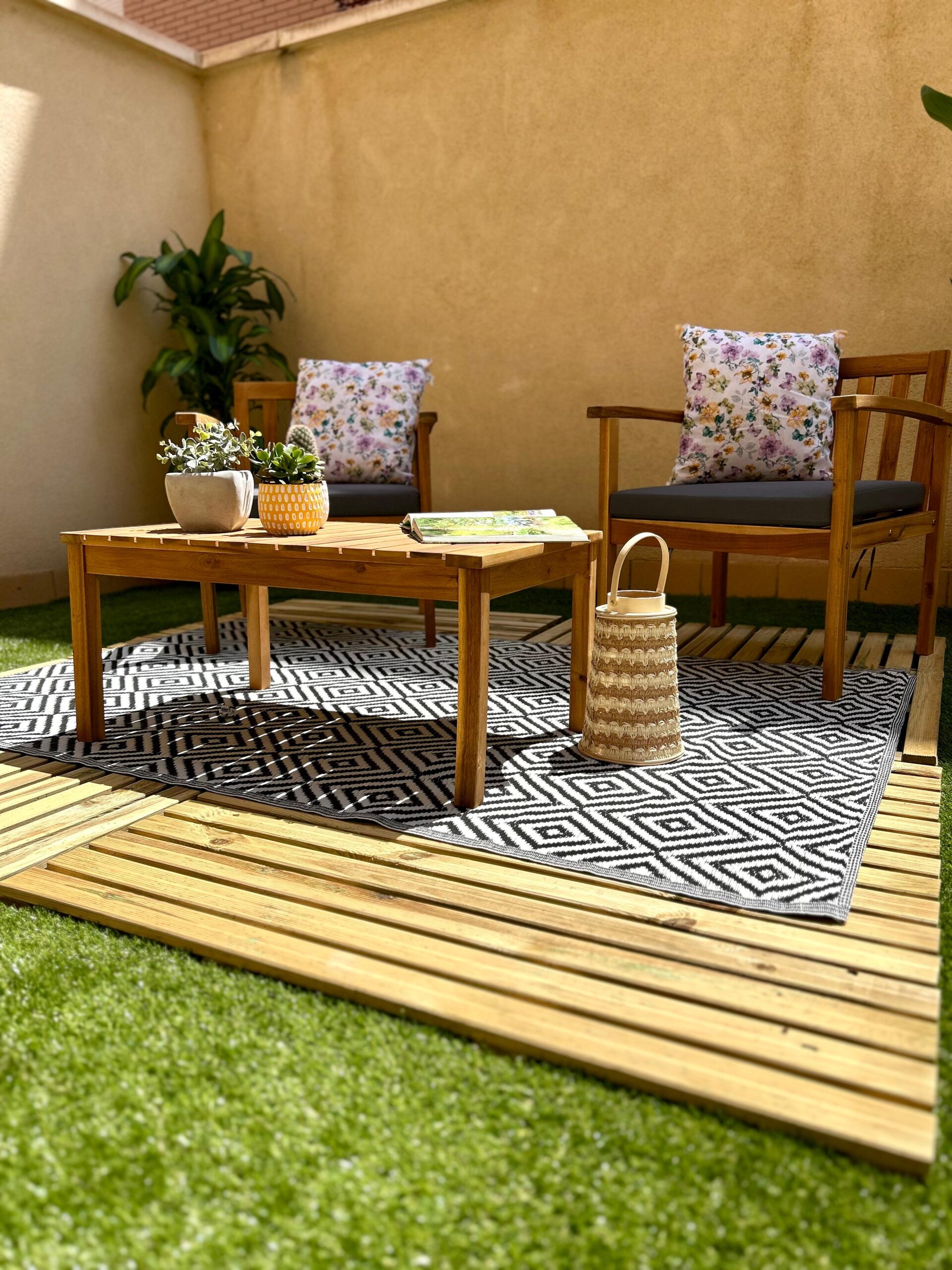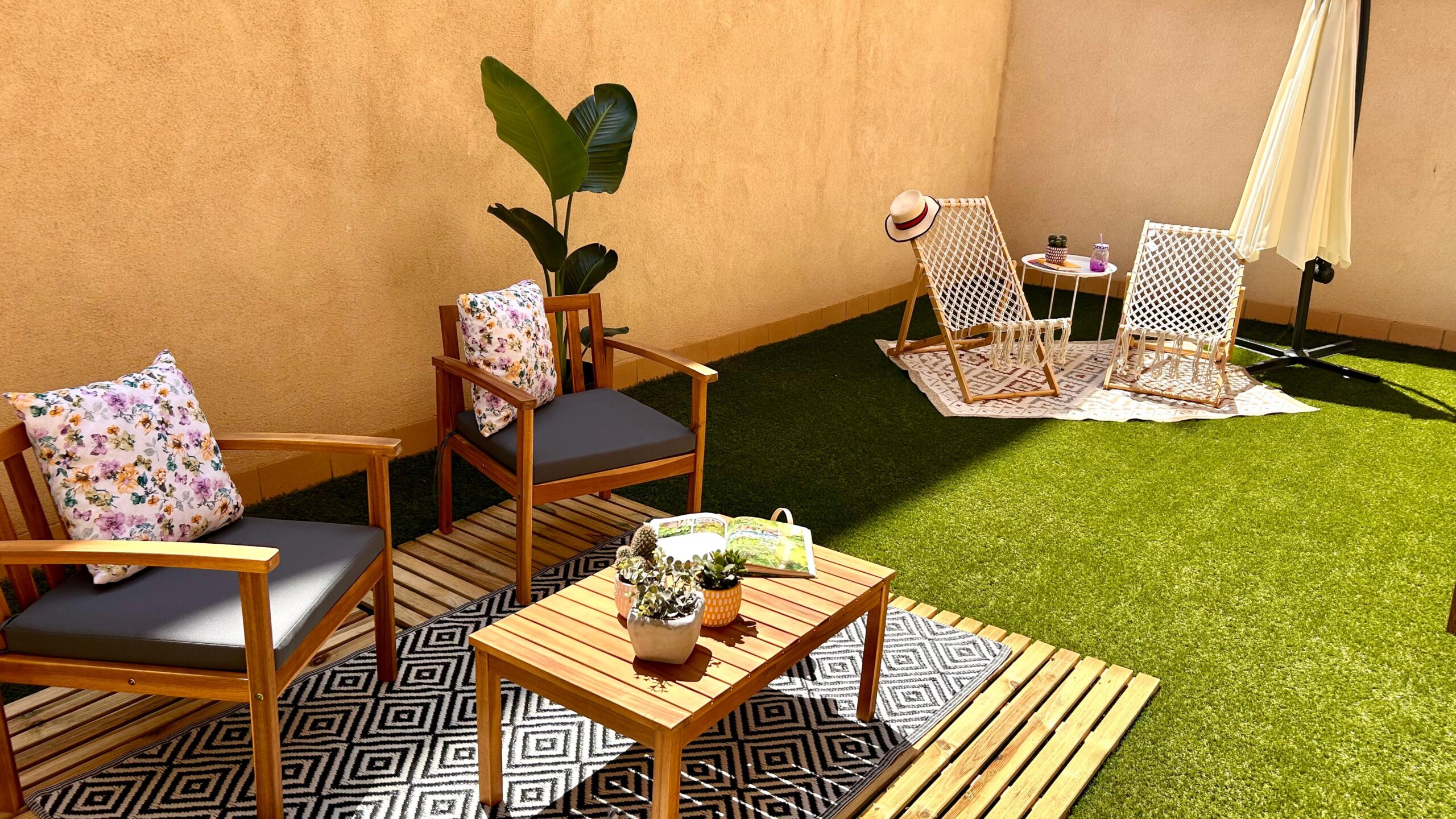 Juego de mesa y sillas, TV 50″, sofá, camas, colchones, armarios, decoración, menaje, ropa de cama, cortinas, desayunador, lámparas, tumbonas, sombrilla de 3 mt de sombra y muebles de jardín.
